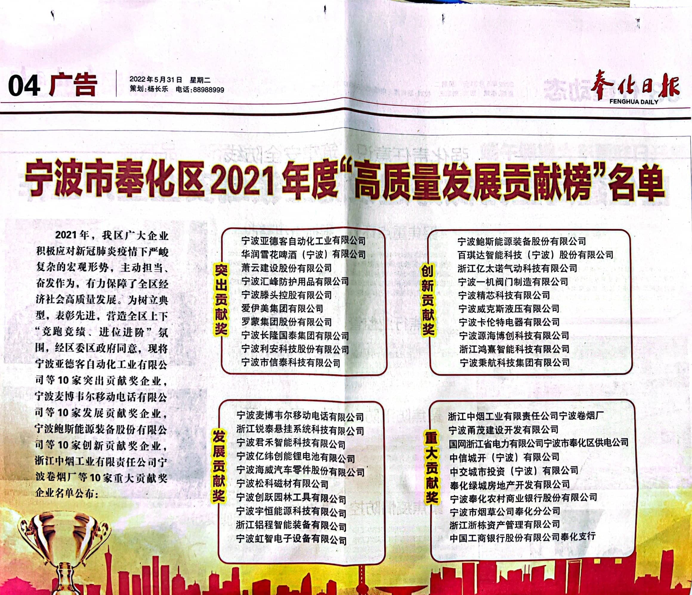 寧波市奉化區2021年度高質量發展貢獻榜”名單
