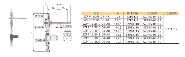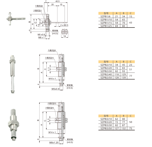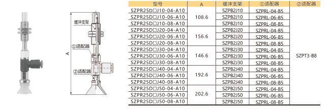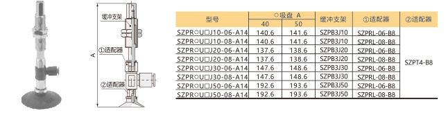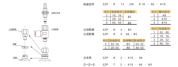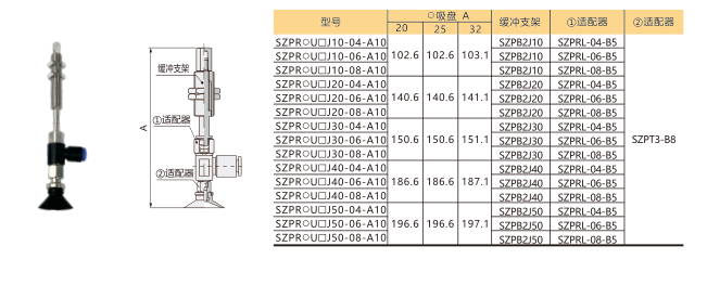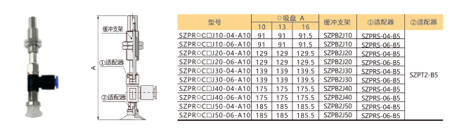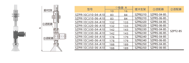 訂貨舉例:SZPT系列帶緩沖型真空吸盤,吸盤直徑?10,平行吸盤,丁晴橡膠,不可回轉型,緩沖行程20,真空連接口:外螺紋M5×0.8;安裝連接螺紋直徑M10X1.0。其訂購碼為:SZPT10UNK20-B5-A10