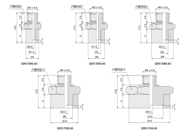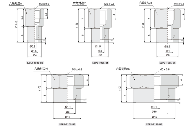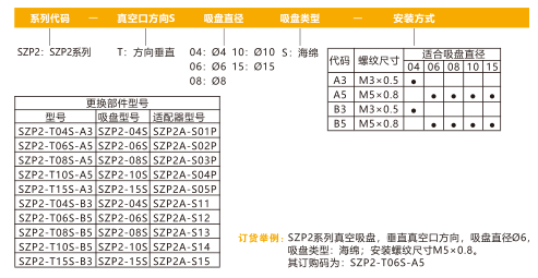 訂貨舉例: SZP2系列真空吸盤,重直真空口方向,吸盤直徑06,吸盤類型:海綿,安裝螺紋尺寸M5x0.8,其訂購碼為: SZP2-T06S-A5