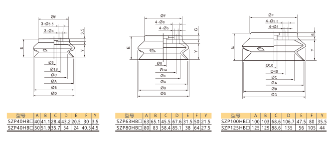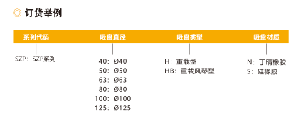 訂貨舉例: SZP系列重載型真空吸盤,吸盤直徑?40,重裁型,丁晴橡膠。其訂購碼為: SZP40HN