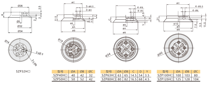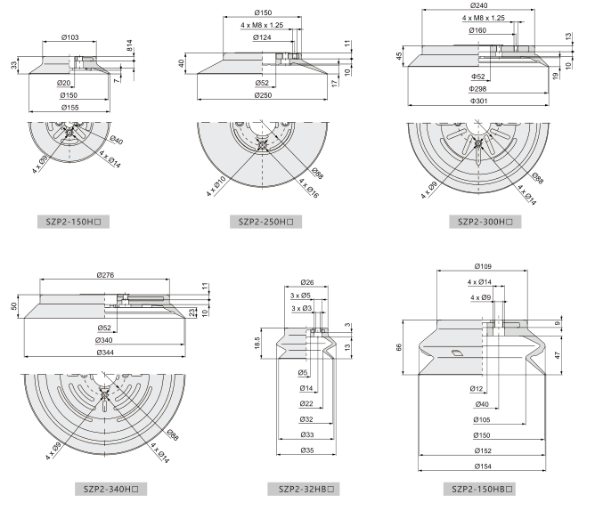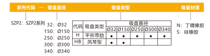 訂貨舉例: SZP2系列重載型真空吸盤,吸盤直徑032,平形帶助,丁晴橡膠,其訂購碼為: SZP2-32HN