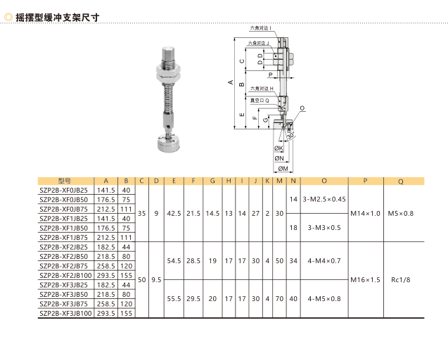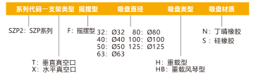 訂貨舉例: SZP2系列重載型不帶緩沖真空吸盤,垂直真空口,搖擺型,吸盤直徑?40,重載型,丁晴橡膠,其訂購碼為: SZP2-TF40HN