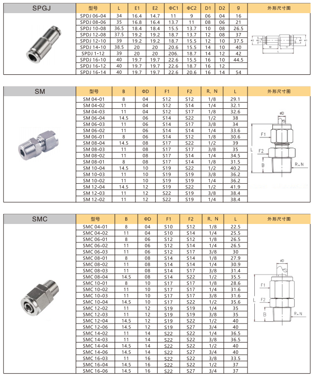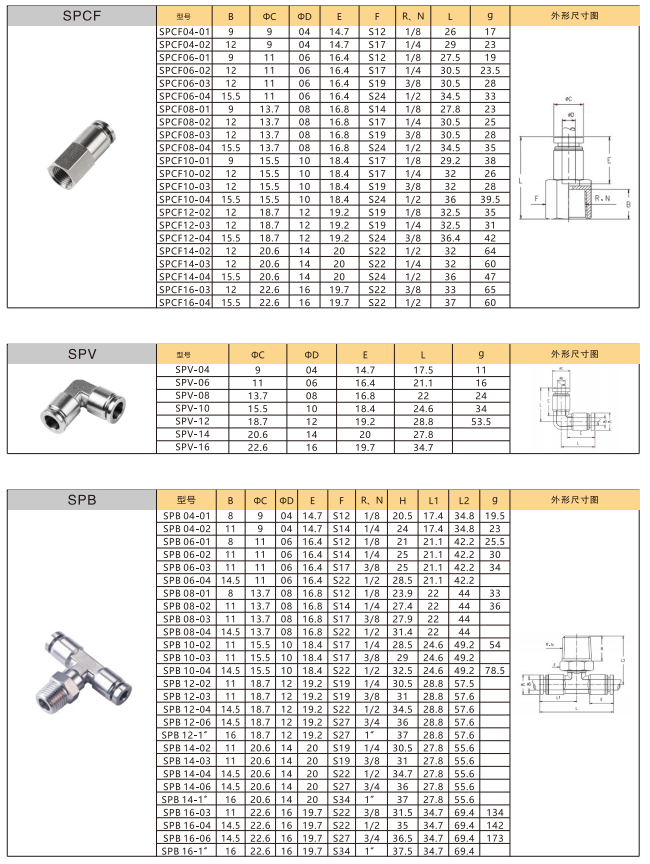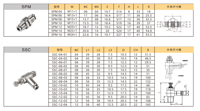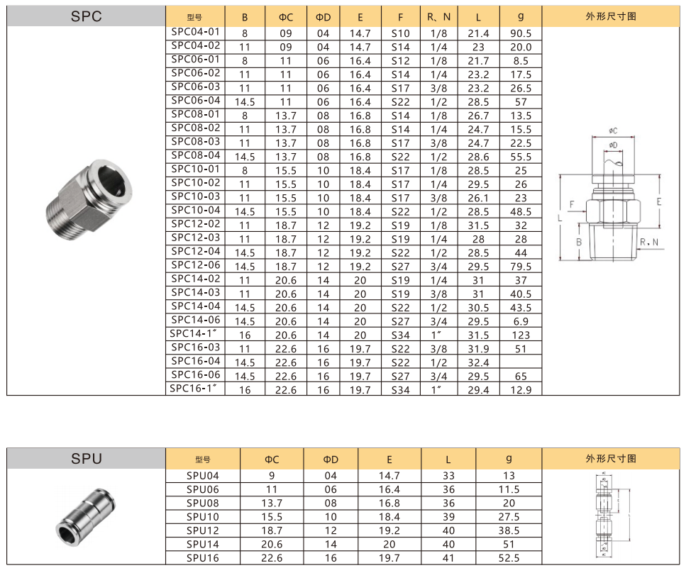 備注:如果兩端皆為插管,則管子外徑尺寸并列顯示,如尺寸相同只顯示一個;如SPU不銹鋼接頭,均配6mm外徑的管子,接頭材質SS316,其ERP編碼為:SPU06S1