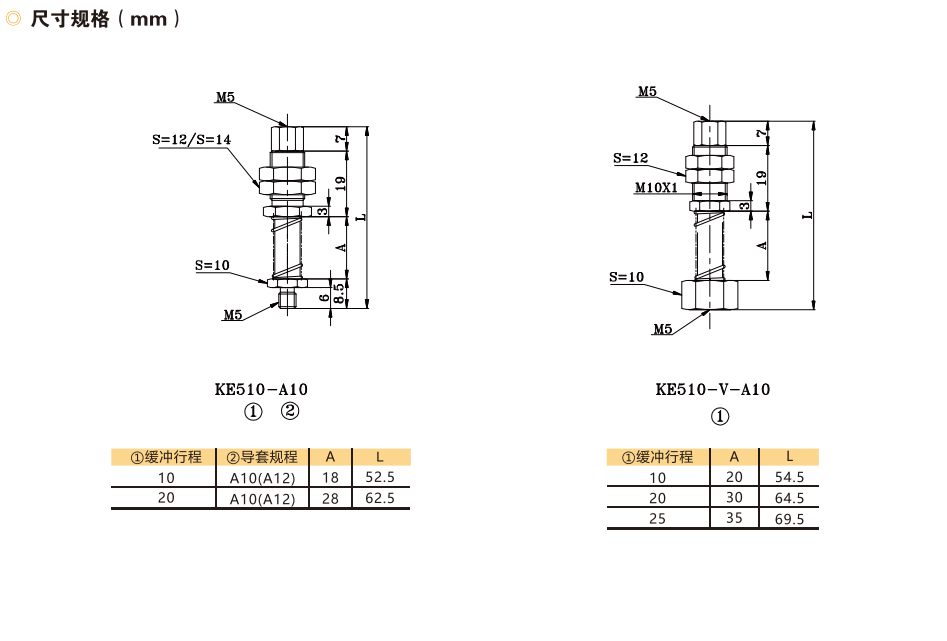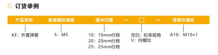 訂貨舉例:KE系列緩沖支桿,連接螺紋規(guī)格M5,緩沖行程10mm,?標(biāo)準(zhǔn)規(guī)格,導(dǎo)套外螺紋M10×1