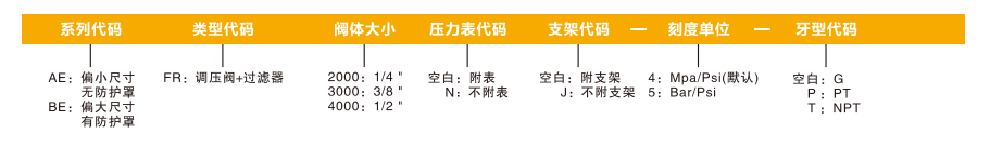 訂貨舉例:AE系列調壓閥+過濾器,2000閥體,附表,附支架,刻度單位為Mpa/Psi,PT牙,其ERP編碼為:AEFR2000-4-P