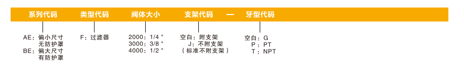 訂貨舉例:AE系列過濾器,2000閥體,附支架,PT牙,其ERP編碼為:AEF2000-P