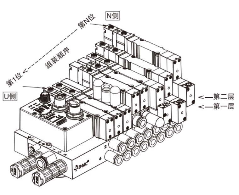 3、不同規格閥,兩層不同疊加模塊混裝時:S系列標準型,2系列,側面接管,識別碼T,PROFINET總線協議,輸出32點,第一第二閥位均為兩位五通雙電控電磁閥SVMT5222,第三閥位為進排氣模塊,第四五閥位均為兩位五通單電控電磁閥SVMT5221,第六七八閥位均為三位五通中泄型電磁閥SVMT5322E,第四閥位配單獨進氣疊加模塊?6氣管,第五閥位配單獨排氣疊加模塊,第六閥位配進氣截止疊加模塊,第七閥位配中位止回疊加模塊,第八閥位第一層配單獨進氣疊加模塊?6氣管,第二層配中位止回疊加模塊,工作口?8氣管接頭,工作電壓DC24V,內部先導式,配線方式為雙電控配線,U側安裝消音器、PL接頭,安裝DIN導軌卡扣及1米DIN導軌,G牙。