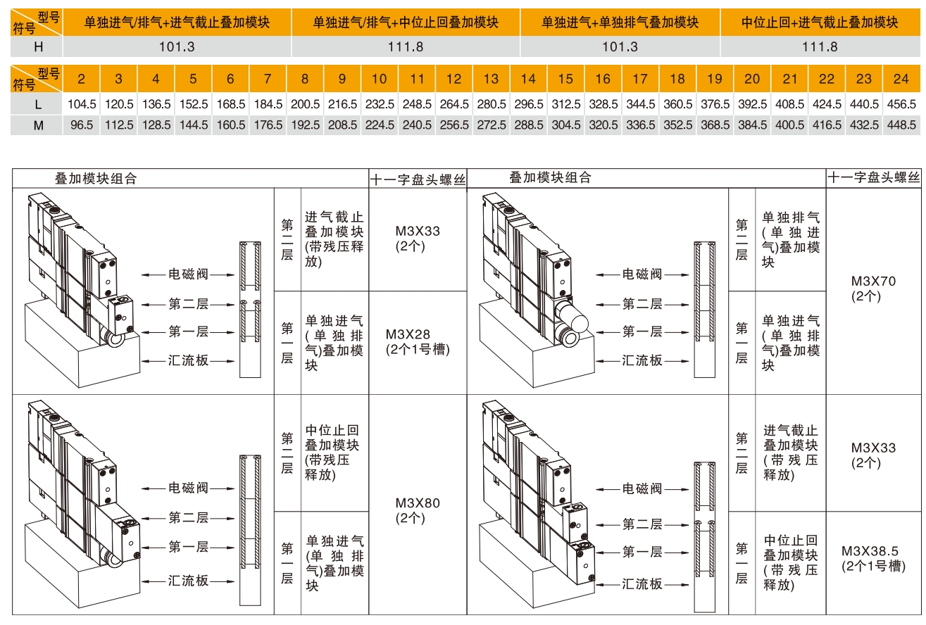 6、⑥中位止回疊加模塊不可用于三位五通(中封)、三位五通(中壓)及2個兩位三通閥位,即W不可與C/PYH/U/YK/HK/UK組合。