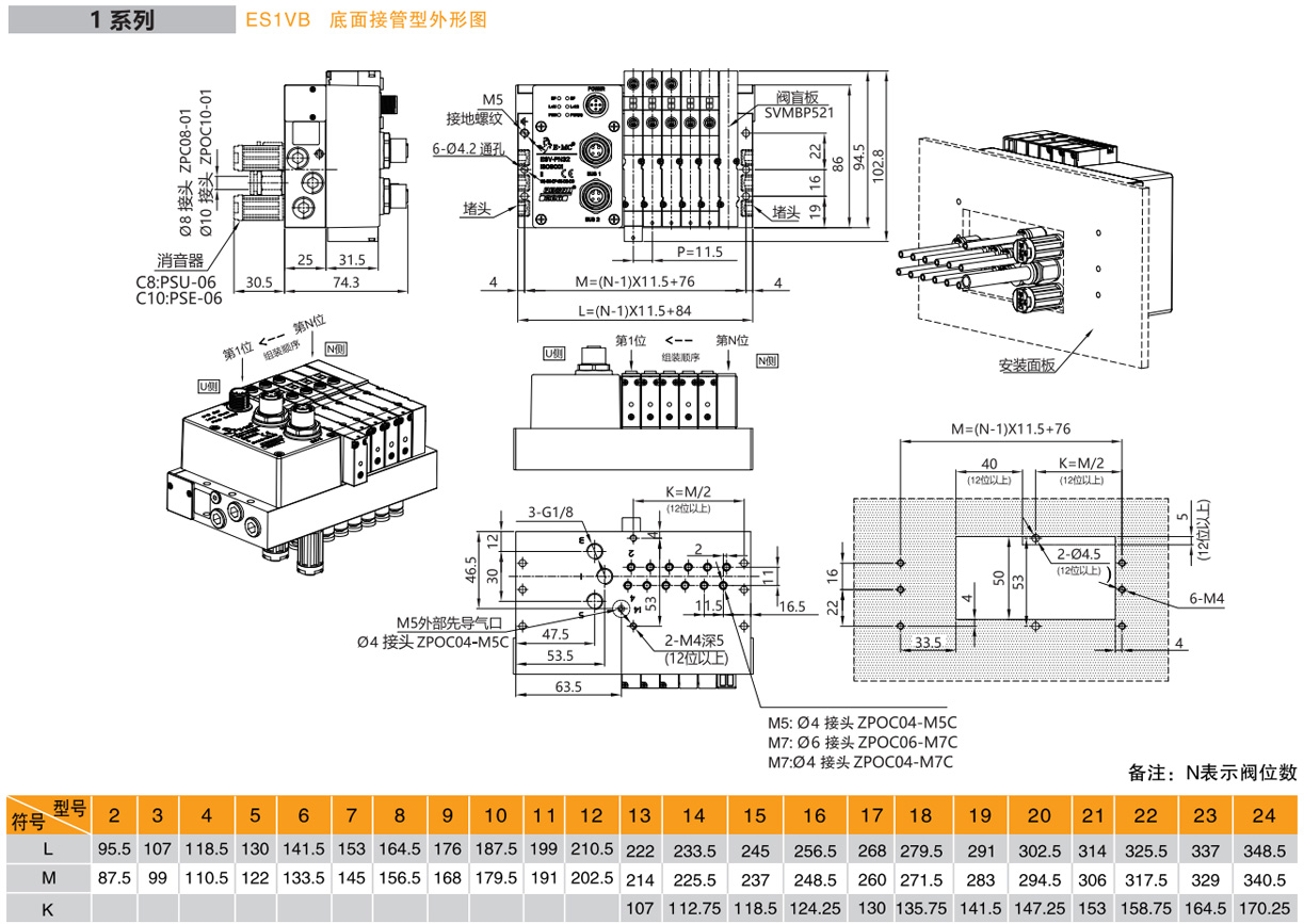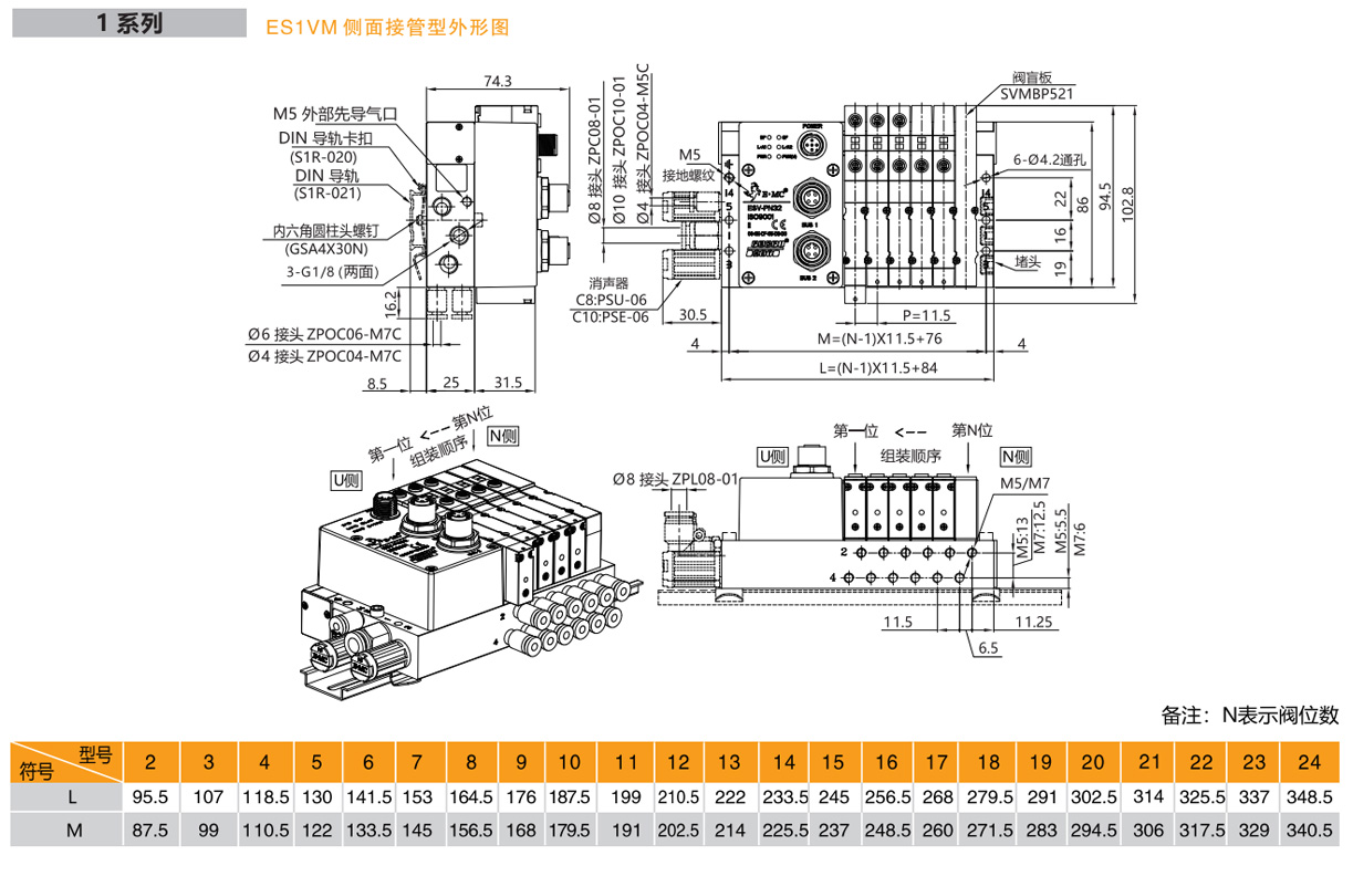 2.不同規格閥混裝時:ES系列總線閥島,1系列,閥上接管,PROFINET總線協議,輸出32點,如右圖所示閥島由第1位為三位五通中封電磁閥SV5312C,第2位為兩位五通雙電控電磁閥SV5212,第3位為2個兩位三通(N.O.)彈簧復位電磁閥SV5412HK,第4、5位為兩位五通單電控電磁閥SV5211,第6位為盲板。第1、2位工作口為?6氣管接頭ZPOC06-M7C,第3至5位工作口均為?4氣管接頭ZPOC04-M7C,工作電壓DC24V,外部先導式,配線方式為雙電控配線,U側安裝消音器、PL接頭?8,安裝DIN導軌卡扣及1米DIN導軌,G牙。