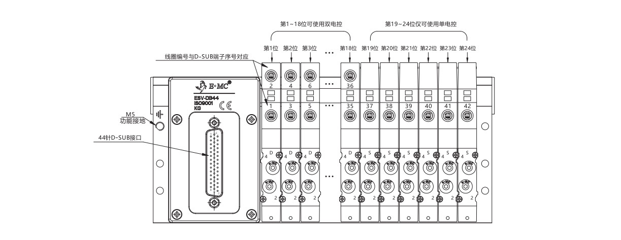 單/雙電控混裝配線示意圖(最多可控制42個線圈,24個閥位,適用于13~18位雙電控配線閥組,在線圈數>36個時,第19~24閥位僅可使用單電控閥;)
