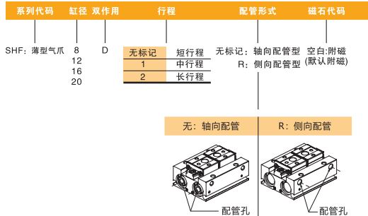 訂貨舉例:SHF薄型氣爪,缸徑為12,中行程,側(cè)面進(jìn)氣,附磁,其ERP編碼為:SHF12D1R。