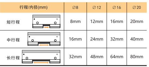 注: 各缸徑的短、中、長3種行程已標(biāo)準(zhǔn)化,可選擇與工件配合最適合的行程。