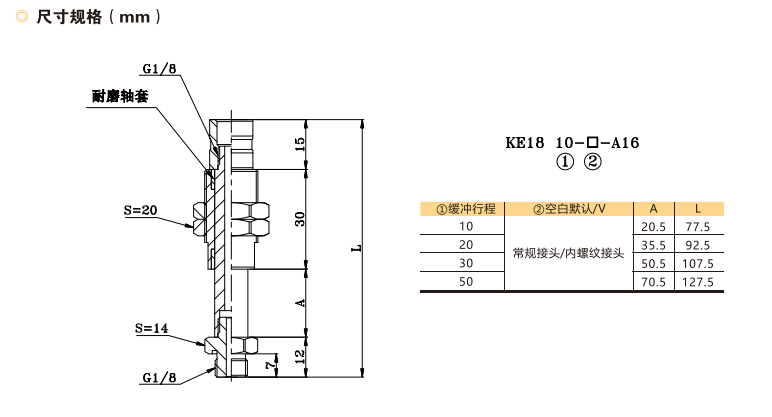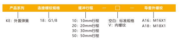 訂貨舉例:KE系列緩沖支桿,連接螺紋規格G1/8,緩沖行程10mm,標準規格,導套外螺紋M16×1其訂購碼為:KE1810-□-A16