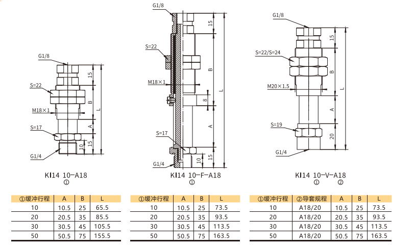 訂貨舉例:KI系列緩沖支桿,連接螺紋規(guī)格G1/4,緩沖行程10mm,標(biāo)準(zhǔn)規(guī)格,導(dǎo)套外螺紋M18×1其訂購碼為:KI1410-□-A18