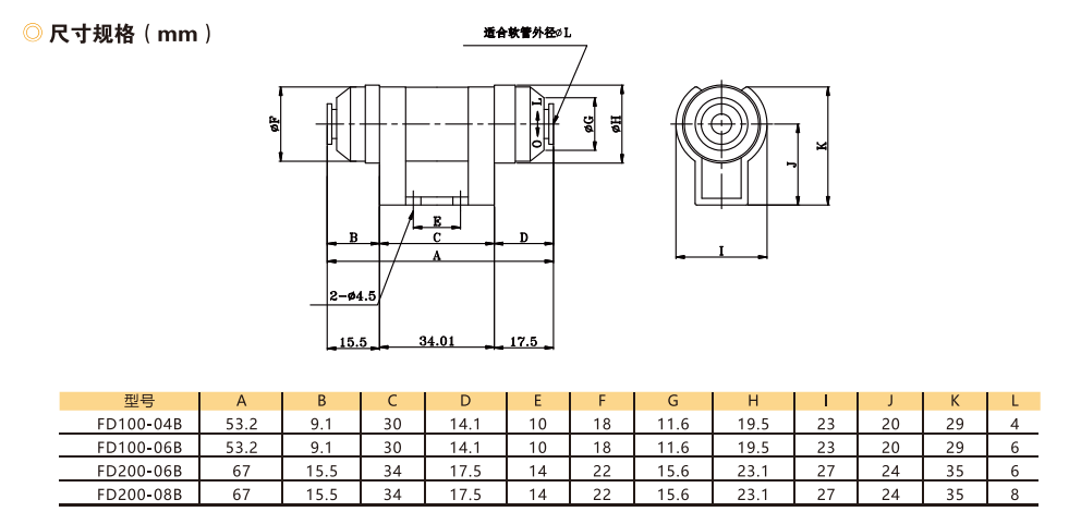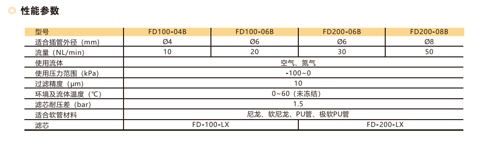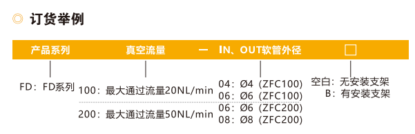 訂貨舉例:FD系列真空過濾器,最大通過流量20NL/min,IN、OUT軟管外徑?4(ZFC100),無安裝支架。其訂購碼為:FD100-04