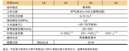 | 內徑(mm) | 標準行程(mm) | 最大行程(mm) | ||||||||||||